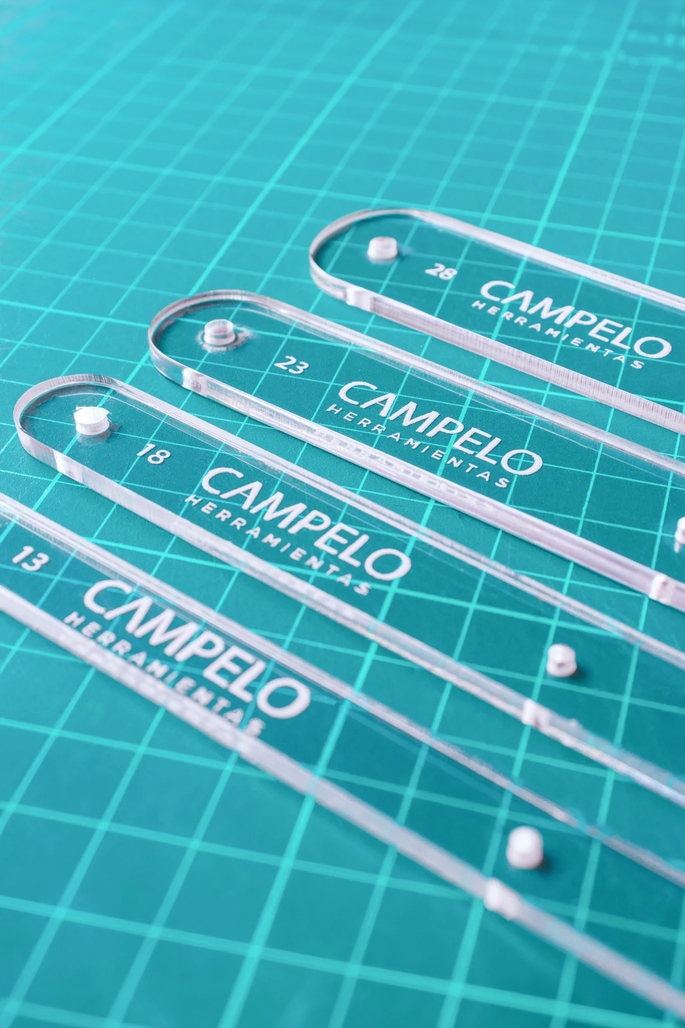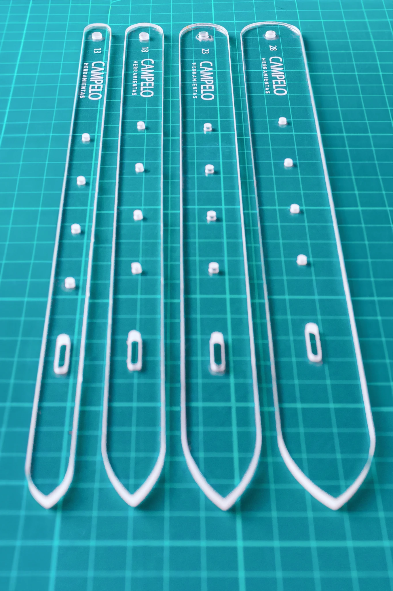 Además, cada regla incluye un óvalo centrado, perfecto para dibujar el agujero necesario para colocar la hebilla. Pero eso no es todo, cada regla también tiene dos terminaciones diferentes en su extremo. Esto te permite dibujar rápidamente una terminación redonda u ojival en tu correa